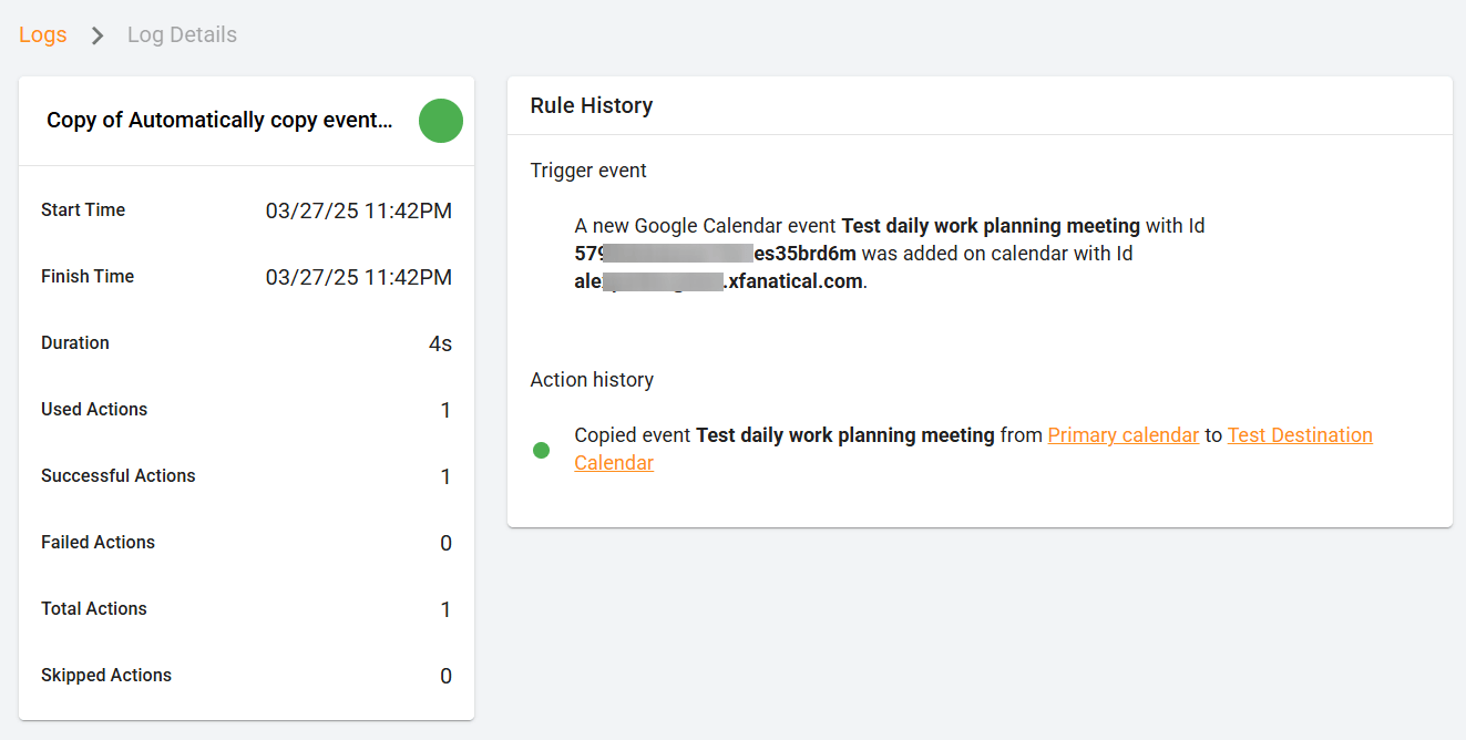- In the Logs > Log details page, the Rule history section explains the automation history and task xFanatical Foresight has automated on behalf of your Google account.