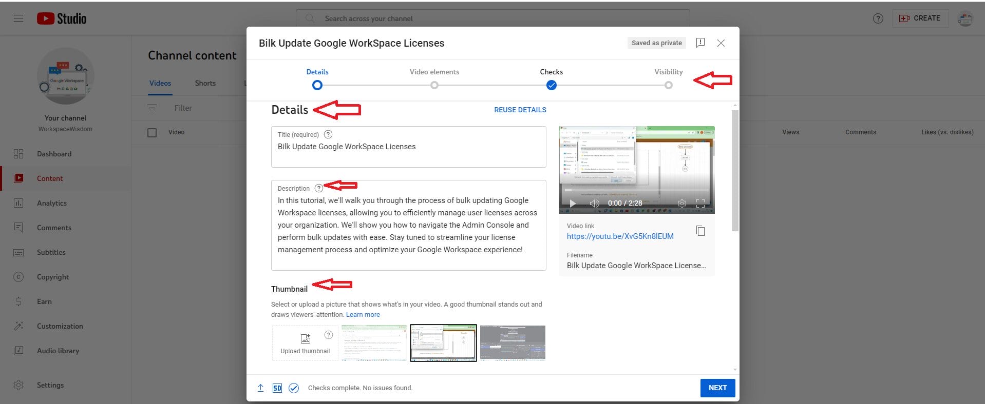 6. Upload your first video: Click on the Content tab in YouTube Studio and select Upload video to start uploading your first video. Make sure to optimize your video title, description, and tags for search engine visibility.