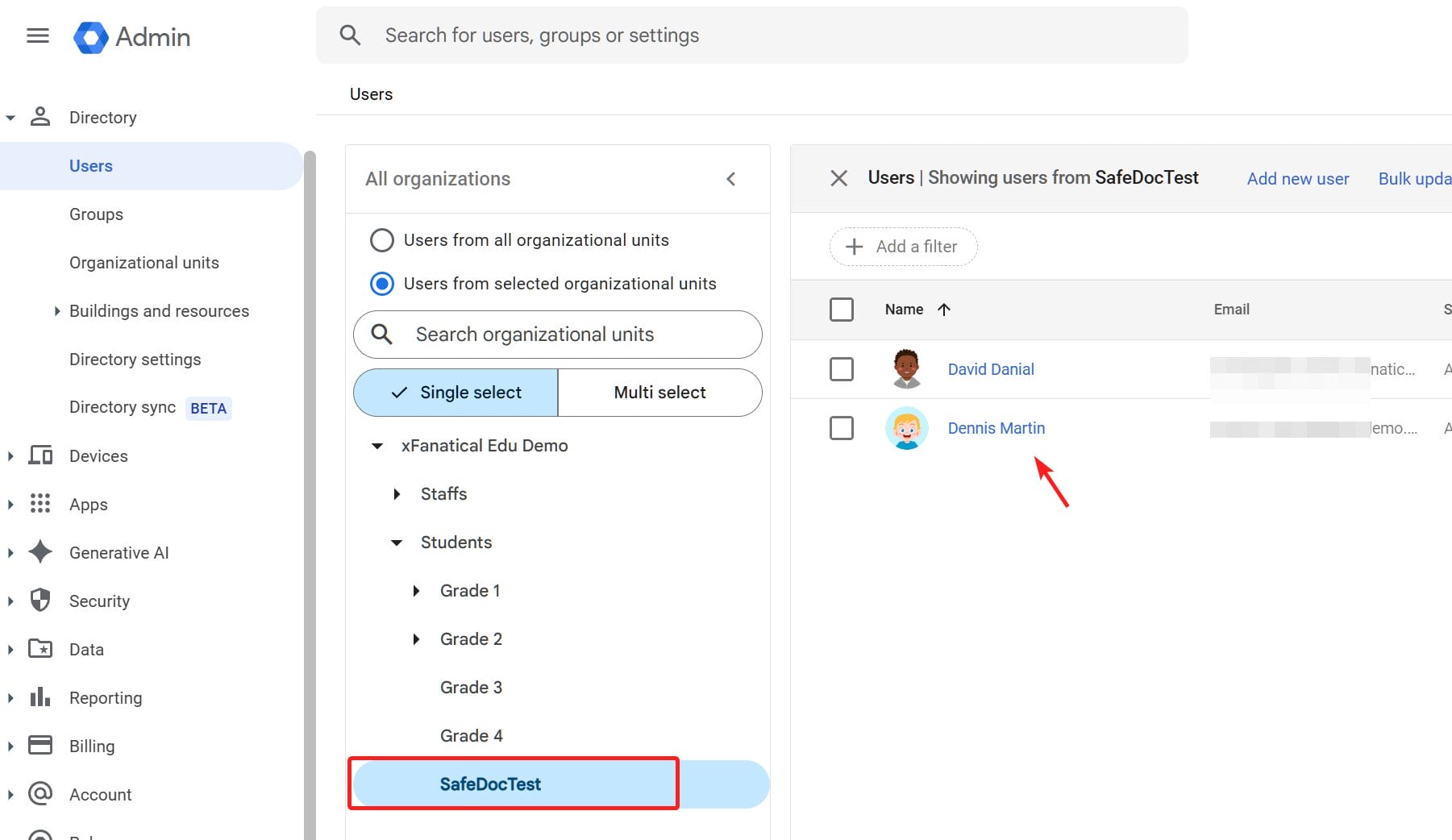 In this article, we use a test OU xFanatical Edu Demo > Students > SafeDocTest in the rest of article for demonstration.