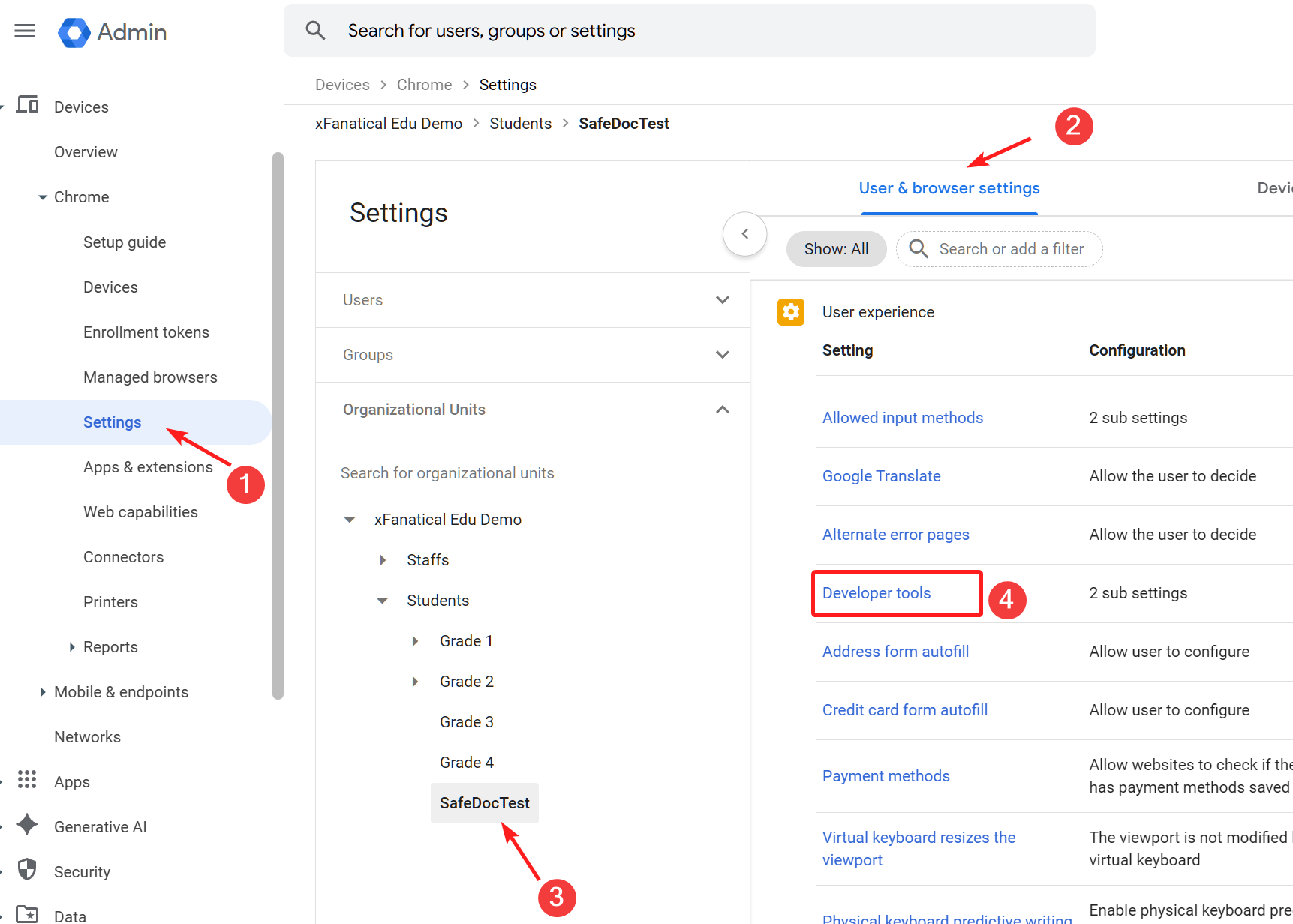 - Go to Devices > Chrome > Settings > User & browser settings.