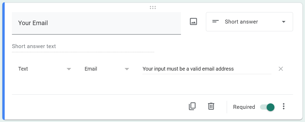 Design a required Short answer type form question such as “Your Email” or "User Email". Optionally, set a validation for the short-answer Text Email. If a respondent enters an invalid email address then the Google form would promptly report an error message.