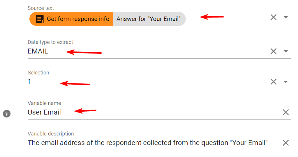 - In the Source text field, select the Answer for "Your Email" variable from the Get form response info action. Note: the "Your Email" is the form question collecting the respondent's email address, which may be different in your Google form.